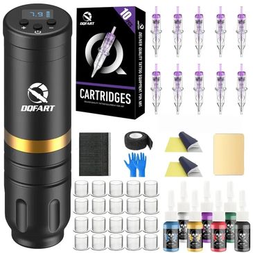 Wireless Rotary Machine with Built-In Rechargeable Lithium Battery, Odorless, 1500Mah, Includes 20 Ink Cartridge Needles, 5 Practice Skins, 5 Transfer Papers, Multi-Colored Inks, And a Complete Set of Tattoo Practice Drawing Tools And Accessories. This Professional Tattoo Kit Is Suitable for Beginners